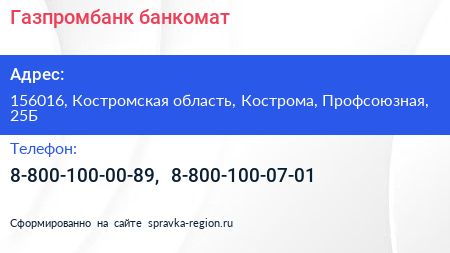 Газпромбанк, банкомат по адресу 156016, Костромская область, Кострома, Профсоюзная, 25Б в дальнейшем Организация, размещена в следующих категориях: