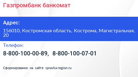 Газпромбанк, банкомат по адресу 156010, Костромская область, Кострома, Магистральная, 20 в дальнейшем Организация, размещена в следующих категориях: