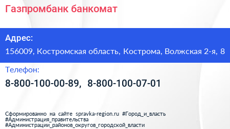 Газпромбанк, банкомат по адресу 156009, Костромская область, Кострома, Волжская 2-я, 8 в дальнейшем Организация, размещена в следующих категориях: