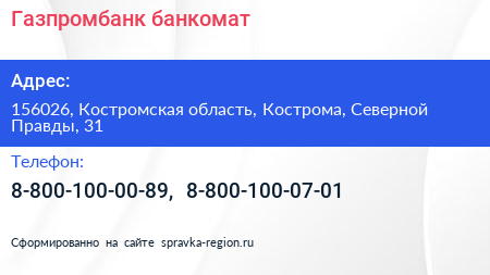 Газпромбанк, банкомат по адресу 156026, Костромская область, Кострома, Северной Правды, 31 в дальнейшем Организация, размещена в следующих категориях: