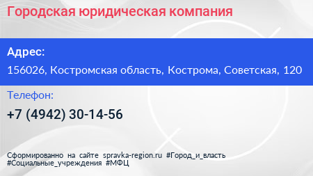 Городская юридическая компания по адресу 156026, Костромская область, Кострома, Советская, 120 в дальнейшем Организация, размещена в следующих категориях: