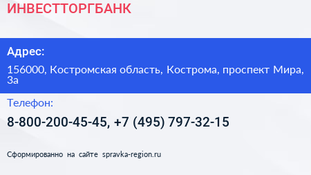 ИНВЕСТТОРГБАНК по адресу 156000, Костромская область, Кострома, проспект Мира, 3а в дальнейшем Организация, размещена в следующих категориях: