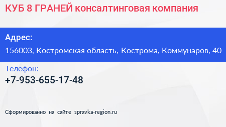КУБ 8 ГРАНЕЙ, консалтинговая компания по адресу 156003, Костромская область, Кострома, Коммунаров, 40 в дальнейшем Организация, размещена в следующих категориях: