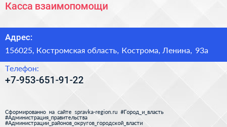 Касса взаимопомощи по адресу 156025, Костромская область, Кострома, Ленина, 93а в дальнейшем Организация, размещена в следующих категориях: