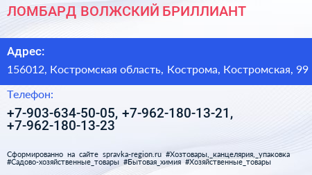 ЛОМБАРД ВОЛЖСКИЙ БРИЛЛИАНТ по адресу 156012, Костромская область, Кострома, Костромская, 99 в дальнейшем Организация, размещена в следующих категориях: