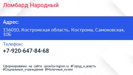 Ломбард Народный по адресу 156010, Костромская область, Кострома, Самоковская, 10Б в дальнейшем Организация, размещена в следующих категориях: