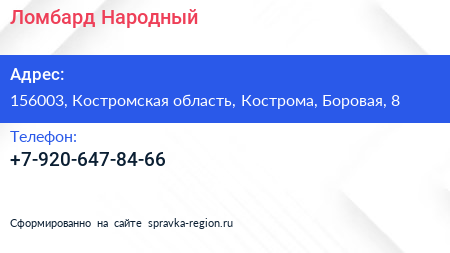 Ломбард Народный по адресу 156003, Костромская область, Кострома, Боровая, 8 в дальнейшем Организация, размещена в следующих категориях: