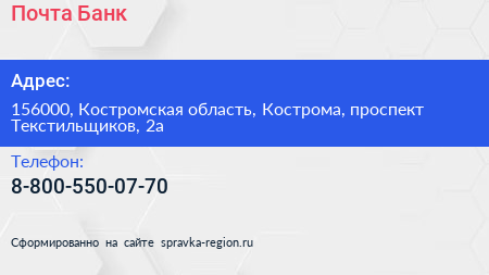 Почта Банк по адресу 156000, Костромская область, Кострома, проспект Текстильщиков, 2а в дальнейшем Организация, размещена в следующих категориях: