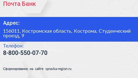 Почта Банк по адресу 156011, Костромская область, Кострома, Студенческий проезд, 9 в дальнейшем Организация, размещена в следующих категориях: