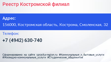 Реестр, Костромской филиал по адресу 156000, Костромская область, Кострома, Смоленская, 32 в дальнейшем Организация, размещена в следующих категориях: