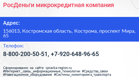 РосДеньги, микрокредитная компания по адресу 156013, Костромская область, Кострома, проспект Мира, 65 в дальнейшем Организация, размещена в следующих категориях: