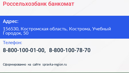 Россельхозбанк, банкомат по адресу 156530, Костромская область, Кострома, Учебный Городок, 50 в дальнейшем Организация, размещена в следующих категориях: