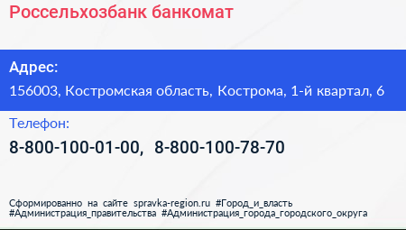 Россельхозбанк, банкомат по адресу 156003, Костромская область, Кострома, 1-й квартал, 6 в дальнейшем Организация, размещена в следующих категориях: