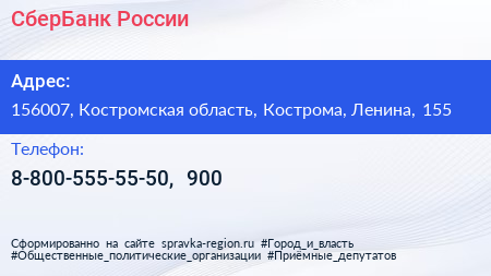 СберБанк России по адресу 156007, Костромская область, Кострома, Ленина, 155 в дальнейшем Организация, размещена в следующих категориях: