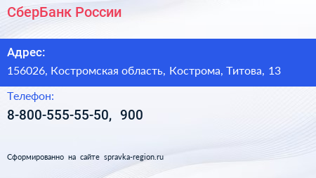 СберБанк России по адресу 156026, Костромская область, Кострома, Титова, 13 в дальнейшем Организация, размещена в следующих категориях: