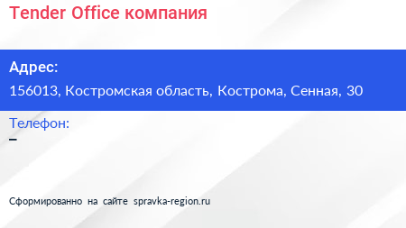 Tender Office, компания по адресу 156013, Костромская область, Кострома, Сенная, 30 в дальнейшем Организация, размещена в следующих категориях: