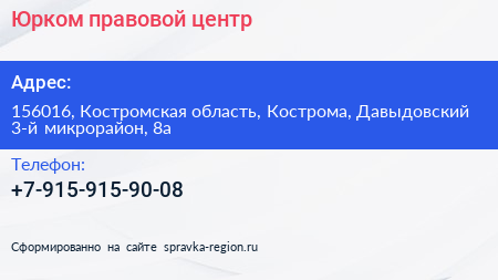 Юрком, правовой центр по адресу 156016, Костромская область, Кострома, Давыдовский 3-й микрорайон, 8а в дальнейшем Организация, размещена в следующих категориях: