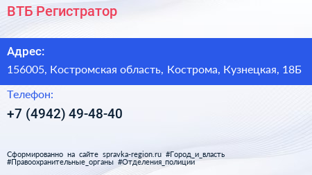 ВТБ Регистратор по адресу 156005, Костромская область, Кострома, Кузнецкая, 18Б в дальнейшем Организация, размещена в следующих категориях: