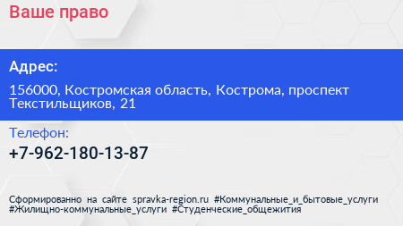Ваше право по адресу 156000, Костромская область, Кострома, проспект Текстильщиков, 21 в дальнейшем Организация, размещена в следующих категориях: