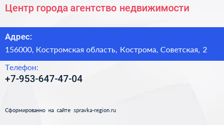 Центр города, агентство недвижимости по адресу 156000, Костромская область, Кострома, Советская, 2 в дальнейшем Организация, размещена в следующих категориях: