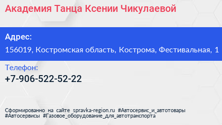 Академия Танца Ксении Чикулаевой по адресу 156019, Костромская область, Кострома, Фестивальная, 1 в дальнейшем Организация, размещена в следующих категориях: