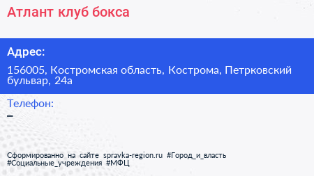 Атлант, клуб бокса по адресу 156005, Костромская область, Кострома, Петрковский бульвар, 24а в дальнейшем Организация, размещена в следующих категориях:
