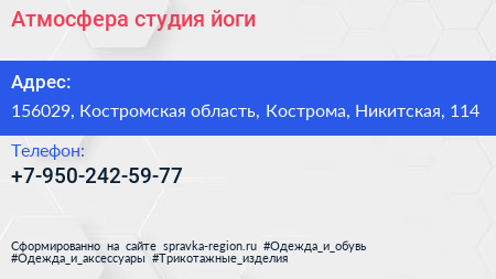 Атмосфера, студия йоги по адресу 156029, Костромская область, Кострома, Никитская, 114 в дальнейшем Организация, размещена в следующих категориях: