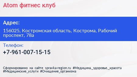 Atom, фитнес-клуб по адресу 156025, Костромская область, Кострома, Рабочий проспект, 78а в дальнейшем Организация, размещена в следующих категориях:
