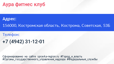 Аура, фитнес-клуб по адресу 156000, Костромская область, Кострома, Советская, 53Б в дальнейшем Организация, размещена в следующих категориях: