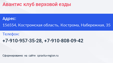 Авантис, клуб верховой езды по адресу 156554, Костромская область, Кострома, Набережная, 35 в дальнейшем Организация, размещена в следующих категориях: