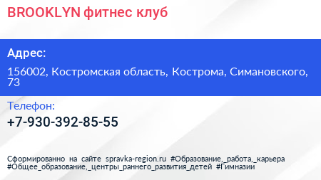 BROOKLYN, фитнес-клуб по адресу 156002, Костромская область, Кострома, Симановского, 73 в дальнейшем Организация, размещена в следующих категориях: