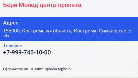 Бери Мопед, центр проката по адресу 156000, Костромская область, Кострома, Симановского, 5Б в дальнейшем Организация, размещена в следующих категориях: