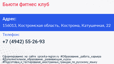 Бьюти, фитнес-клуб по адресу 156013, Костромская область, Кострома, Катушечная, 22 в дальнейшем Организация, размещена в следующих категориях: