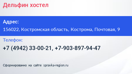 Дельфин, хостел по адресу 156022, Костромская область, Кострома, Почтовая, 9 в дальнейшем Организация, размещена в следующих категориях: