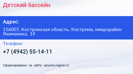 Детский бассейн по адресу 156007, Костромская область, Кострома, микрорайон Якиманиха, 19 в дальнейшем Организация, размещена в следующих категориях: