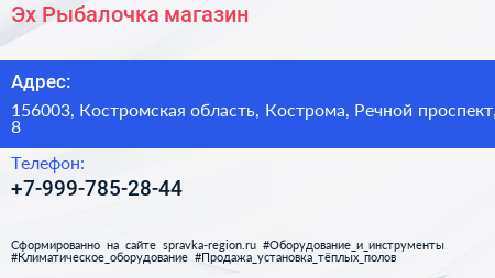 Эх! Рыбалочка, магазин по адресу 156003, Костромская область, Кострома, Речной проспект, 8 в дальнейшем Организация, размещена в следующих категориях: