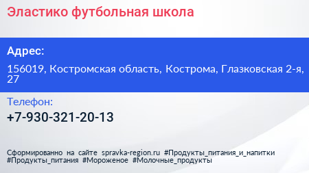 Эластико, футбольная школа по адресу 156019, Костромская область, Кострома, Глазковская 2-я, 27 в дальнейшем Организация, размещена в следующих категориях: