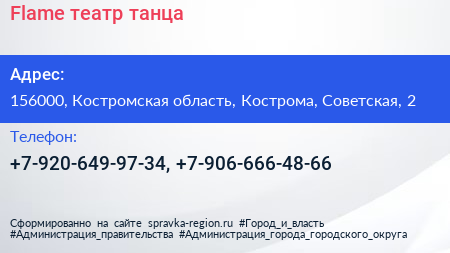 Flame, театр танца по адресу 156000, Костромская область, Кострома, Советская, 2 в дальнейшем Организация, размещена в следующих категориях: