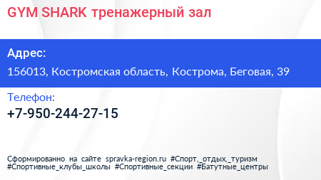 GYM SHARK, тренажерный зал по адресу 156013, Костромская область, Кострома, Беговая, 39 в дальнейшем Организация, размещена в следующих категориях: