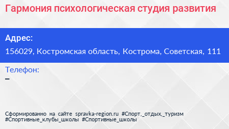 Гармония, психологическая студия развития по адресу 156029, Костромская область, Кострома, Советская, 111 в дальнейшем Организация, размещена в следующих категориях: