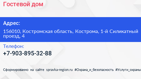 Гостевой дом по адресу 156010, Костромская область, Кострома, 1-й Силикатный проезд, 4 в дальнейшем Организация, размещена в следующих категориях: