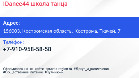 IDance44, школа танца по адресу 156003, Костромская область, Кострома, Ткачей, 7 в дальнейшем Организация, размещена в следующих категориях: