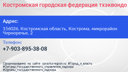 Костромская городская федерация тхэквондо по адресу 156026, Костромская область, Кострома, микрорайон Черноречье, 2 в дальнейшем Организация, размещена в следующих категориях: