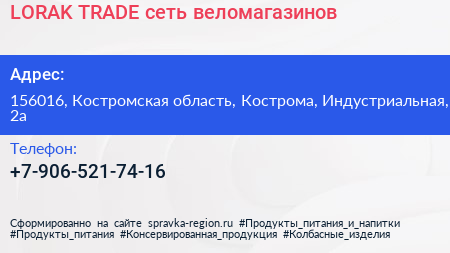 LORAK TRADE, сеть веломагазинов по адресу 156016, Костромская область, Кострома, Индустриальная, 2а в дальнейшем Организация, размещена в следующих категориях: