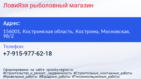 ЛовиЯзя, рыболовный магазин по адресу 156001, Костромская область, Кострома, Московская, 98/2 в дальнейшем Организация, размещена в следующих категориях: