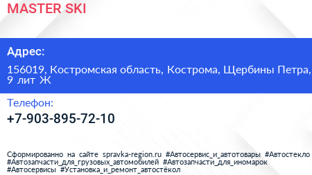 MASTER-SKI по адресу 156019, Костромская область, Кострома, Щербины Петра, 9 лит Ж в дальнейшем Организация, размещена в следующих категориях: