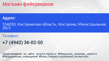 Магазин фейерверков по адресу 156010, Костромская область, Кострома, Магистральная, 20/1 в дальнейшем Организация, размещена в следующих категориях: