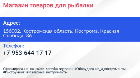 Магазин товаров для рыбалки по адресу 156002, Костромская область, Кострома, Красная Слобода, 36 в дальнейшем Организация, размещена в следующих категориях: