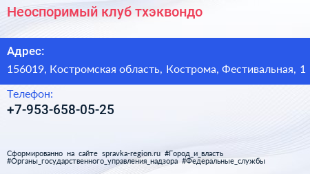 Неоспоримый, клуб тхэквондо по адресу 156019, Костромская область, Кострома, Фестивальная, 1 в дальнейшем Организация, размещена в следующих категориях: