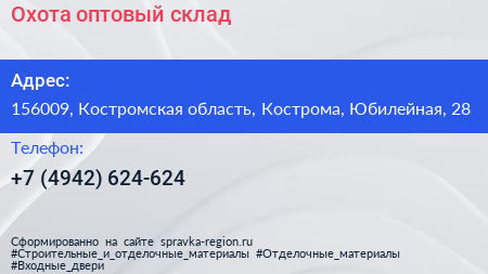 Охота, оптовый склад по адресу 156009, Костромская область, Кострома, Юбилейная, 28 в дальнейшем Организация, размещена в следующих категориях: